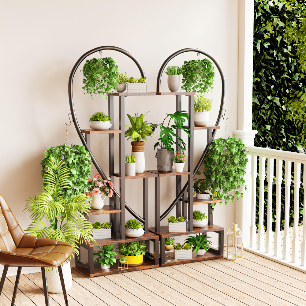 Les multiples supports de rangement permettent de disposer vos plantes de manière esthétique et pratique. Que ce soit pour des plantes suspendues ou des pots posés, chaque niveau offre une stabilité et une organisation optimale. Cette étagère en métal et bois allie robustesse et style, faisant de votre espace de vie un endroit unique et accueillant.