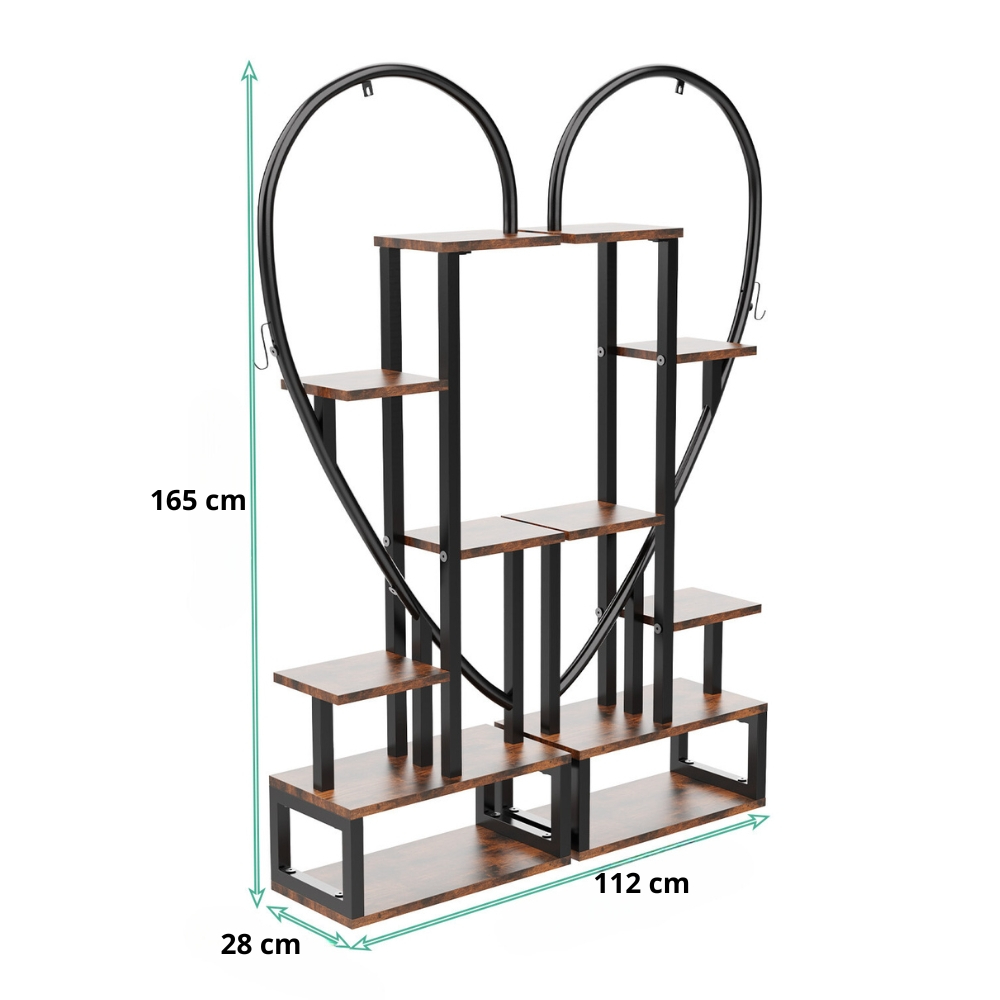 Notre grande étagère murale en forme de cœur est spécialement conçue pour mettre en valeur vos plantes. Avec ses dimensions généreuses de 165 cm de hauteur et 112 cm de largeur, elle offre un espace idéal pour exposer une variété de plantes de différentes tailles. Certaines pourront être suspendues.