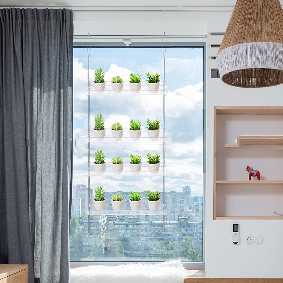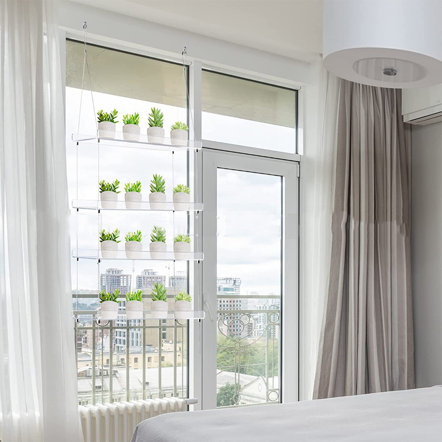 Vous pourrez facilement installer notre étagère murale transparente suspendue dans n’importe qu’elle pièce, de la cuisine à la chambre en passant par le salon. Selon la taille de vos pots, vous pourrez placer par étage 2 à 4 pots. Cette étagère suspendue ne sert pas seulement à ajouter une touche de verdure à votre intérieur, vous pourrez aussi alterner avec des petits objets de déco pour une touche encore plus personnelle.