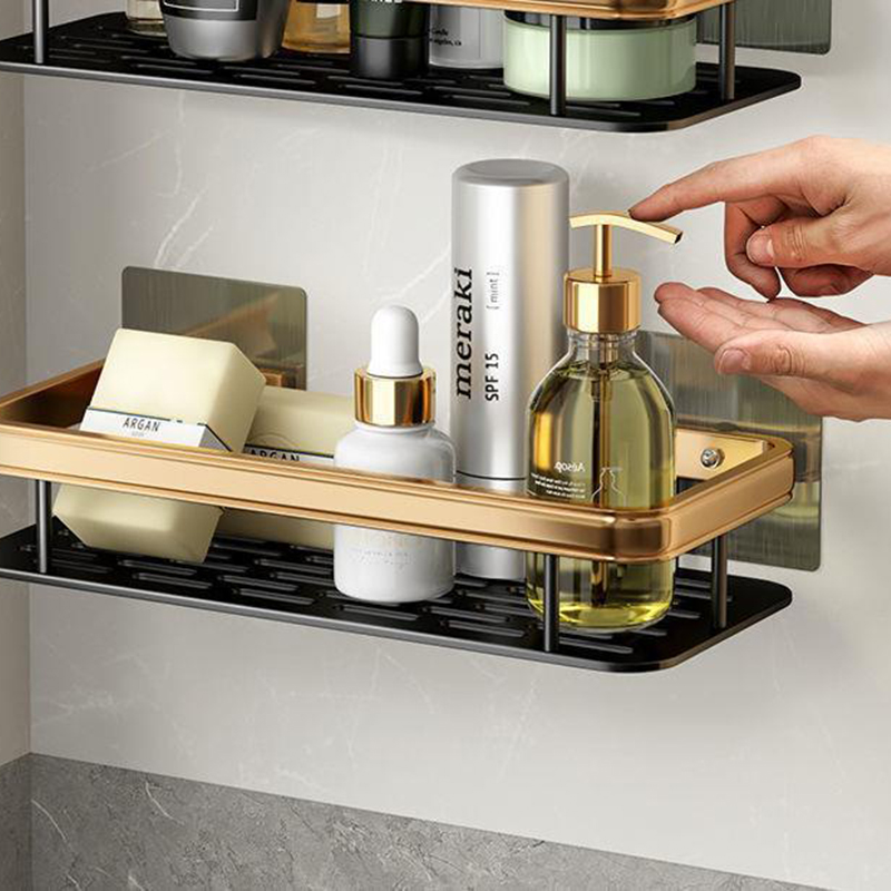 Cette étagère murale est faite d’un mélange de métal résistant à la corrosion, de ce fait l’eau ne s’incruste pas et cette étagère restera inchangée après de nombreuses années. La somptueuse finition doré qui ressort à la perfection contre le cadre noir mat scelle le look incroyable de cette étagère. Vos produits d’hygiène et shampoings seront également parfaitement maintenues grâce au rebord solide.