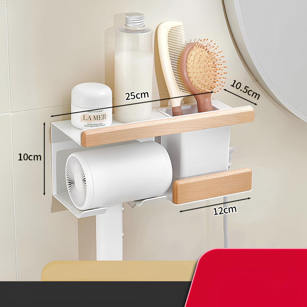 Grâce à notre étagère murale, gardez tous vos essentiels de beauté organisés et à portée de main. Le support dédié pour le sèche-cheveux vous permet de le ranger en toute sécurité, tandis que le récipient pratique accueille vos brosses et peignes.