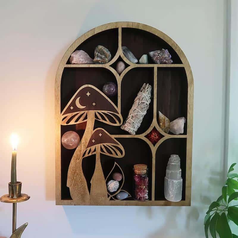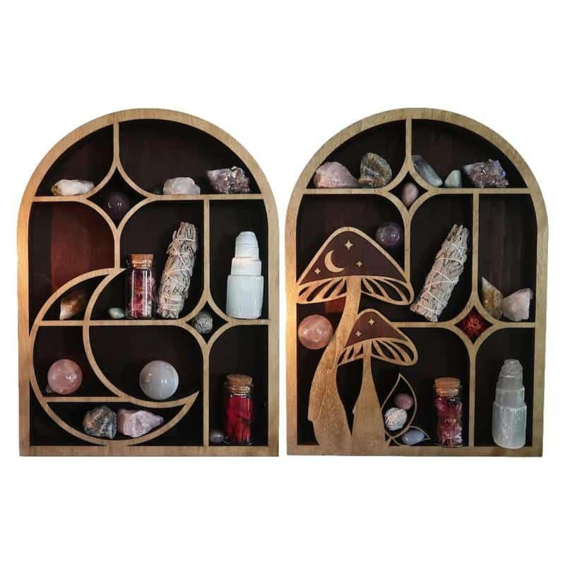 Que vous choisissiez le modèle avec la lune ou celui orné de motifs de champignons, chaque étagère est une véritable œuvre d’art qui met en valeur vos collections.