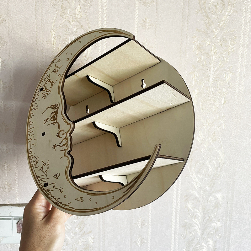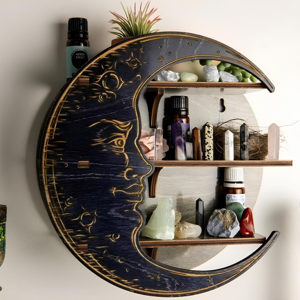 Cette étagère en forme de lune offre une solution de rangement polyvalente et esthétique. Avec ses étagères spacieuses, elle est idéale pour exposer vos cristaux, huiles essentielles, livres ou autres objets précieux.